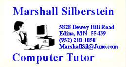 You bought that Computer - Now What? Marshall Silberstein is a colleague of mine who can offer patient and effective tutoring for new computer users. If you have some computer issues that you need to become comfortable with, this may be your answer. Click Marshall's card below and contact him with your ideas, and to obtain a price estimate.